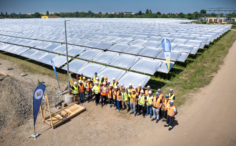 Geschafft! Das stolze Team des Solarthermie-Großprojekts Leipzig West freut sich über die Montage vom finalen Solarthermiekollektor Nr. 13.224 auf dem insgesamt 65.208 Quadratmeter großen Kollektorfeld. Foto: Leipziger Stadtwerke