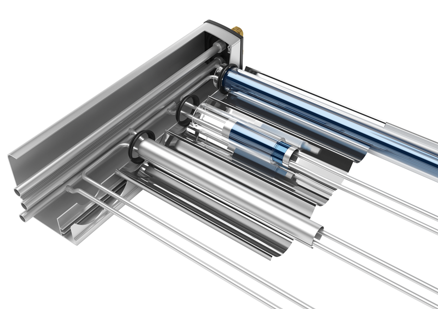 Das Schnittmodell unseres Paradigma Solarthermiekollektors Aqua Plasma verdeutlicht euch den Aufbau der CPC-Vakuumröhren. Grafik: Paradigma