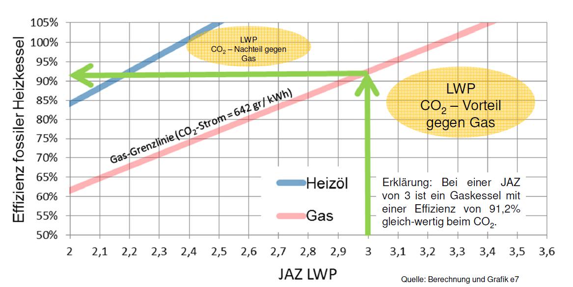 CO2 Vergleich: Luftwärmepumpe (LWP) gegenüber Gas bzw. Heizöl; JAZ = Jahresarbeitszahl