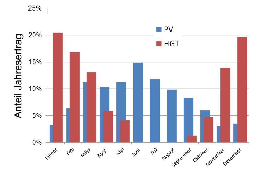 Verteilung der Jahreswärmenachfrage (HGT) und des Ertrags einer Photovoltaikanlage (PV), realer Standort, 2014 Quelle: e7 Berechnungen 2015