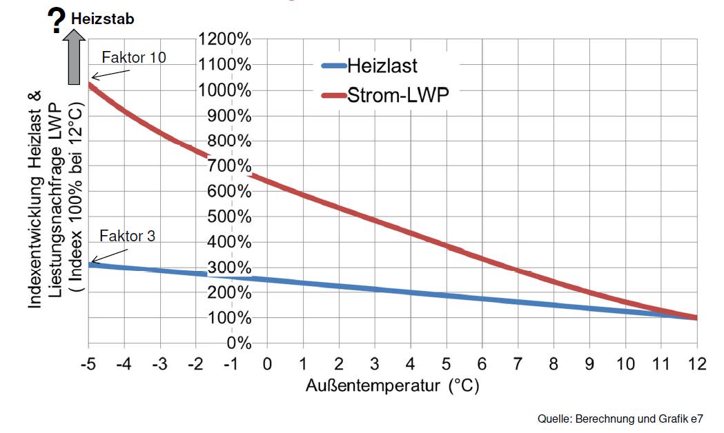 Was man außerdem nicht vergessen darf: Bei sinkender Außentemperatur steigt der Strombedarf überproportional zur Heizlast, wie die Grafik unten eindrücklich belegt. Deshalb werden etliche Wärmepumpenanlagen unterdimensioniert; bei besonders hohen Heizlasten springt dann ein so genannter Heizstab ein, der nichts anderes ist als eine Stromdirektheizung. Die Studie kommt zu der Einschätzung, dass der Heizstab die Spitzenlast im Stromnetz erhöht.